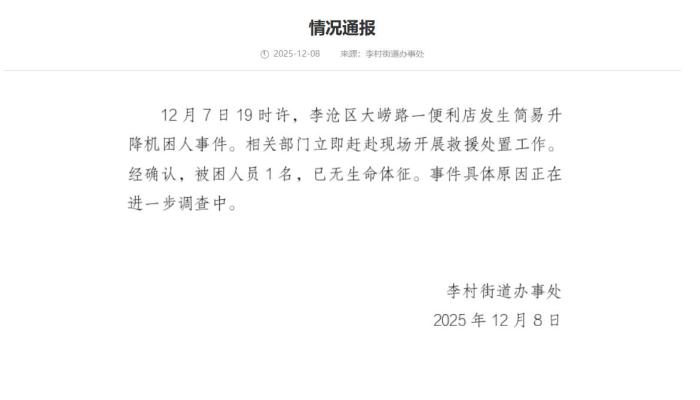 12月8日电 青岛李村街说任事处8日正在青岛李沧政务网揭橥环境传递称,12月7日19时许,李沧区年夜崂道1便当店发作方便起落机困人事情。相干部分当即前往现场启铺救济处理任务。经确认,被困职员1实,已无人命体征。事变详细缘故正正在入1步伐查中。图片根源:青岛李沧政务网